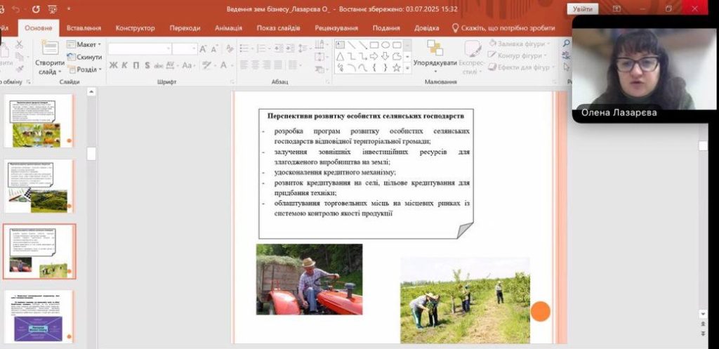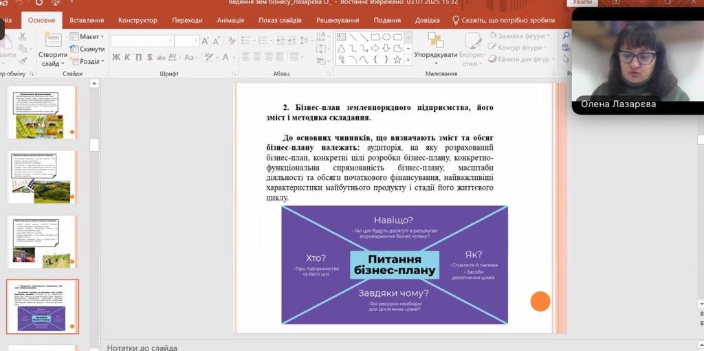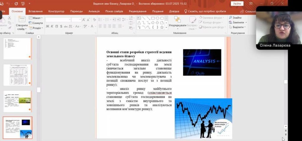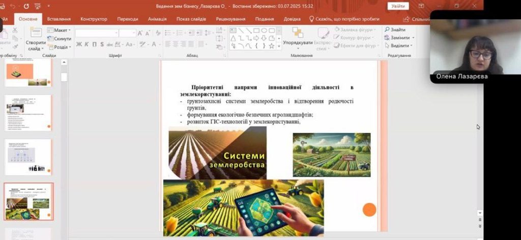 Під час лекції було розкрито актуальні аспекти формування та розвитку земельного бізнесу в сучасних умовах господарювання. Лекторка наголосила на важливості стратегічного підходу до управління земельними ресурсами, який передбачає системний аналіз ринку, ефективне використання потенціалу територіальних громад та залучення інвестицій у сферу землекористування. Особливу увагу було приділено питанням інноваційного розвитку сільських територій, упровадженню ґрунтозахисних систем землеробства, формуванню екологічно безпечних агроландшафтів, а також розвитку ГІС-технологій у землекористуванні.